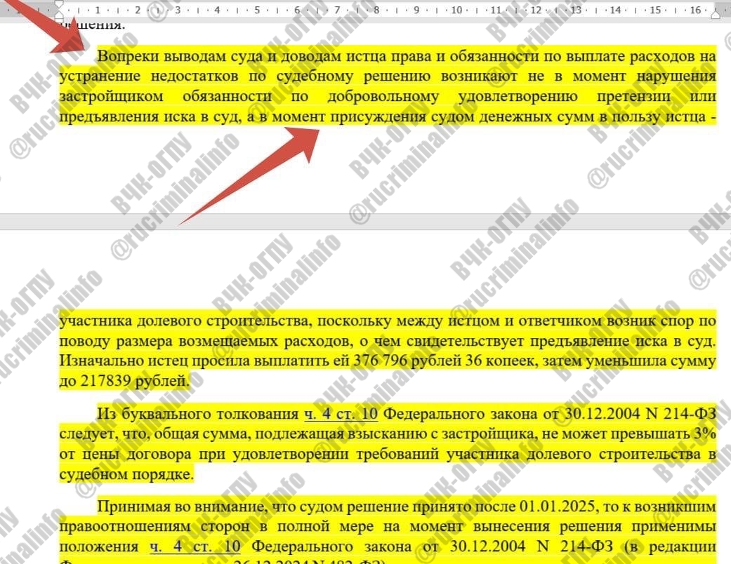 After these instructions, developers began to appeal all decisions en masse. At a meeting at the Ministry of Construction, it was said that the following wording would be included in the court decision: “the rights and obligations of the Plaintiff to pay the costs of eliminating the deficiencies under the court decision arise not at the time of the developer’s violation of the obligation to voluntarily satisfy the claim or file a lawsuit in court, but at the time the court awards monetary amounts.” (See the attached screenshot). This wording is far from consistent with current legislation and common sense. Firstly, the law does not have retroactive effect. And secondly, if the Plaintiff’s right arises at the time the court makes a decision, then on what basis does the Plaintiff go to court, if does he not have these rights on the date of filing the claim?
