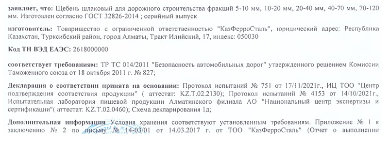 Здесь появляется первая несуразица. Шлаковый щебень — это не отходы производства, а вполне котируемый товар, активно используемый в дорожном строительстве. Что подтверждается документами, в том числе ГОСТ 32826-2014, письмом АО «КазДорНИИ» и даже декларацией соответствия ЕАЭС.