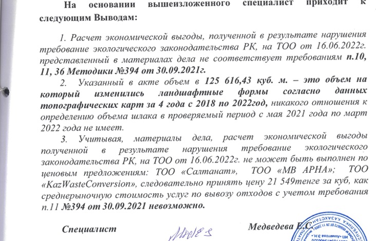 И наконец сам расчет возможной экономической выгоды завода. За основу экологи взяли рыночные расценки услуги по вывозу промышленных отходов. Однако в суде представители указанных департаментом компаний открестились – мол, такие услуги не предоставляем, у нас даже разрешения на это нет. Более того, по расчетам экологов только за одну машину «отходов», завод должен выложить почти 700 тысяч тенге, что мало похоже на реальность. Однако суд первой инстанции не принял во внимание доводы юристов и экспертов.