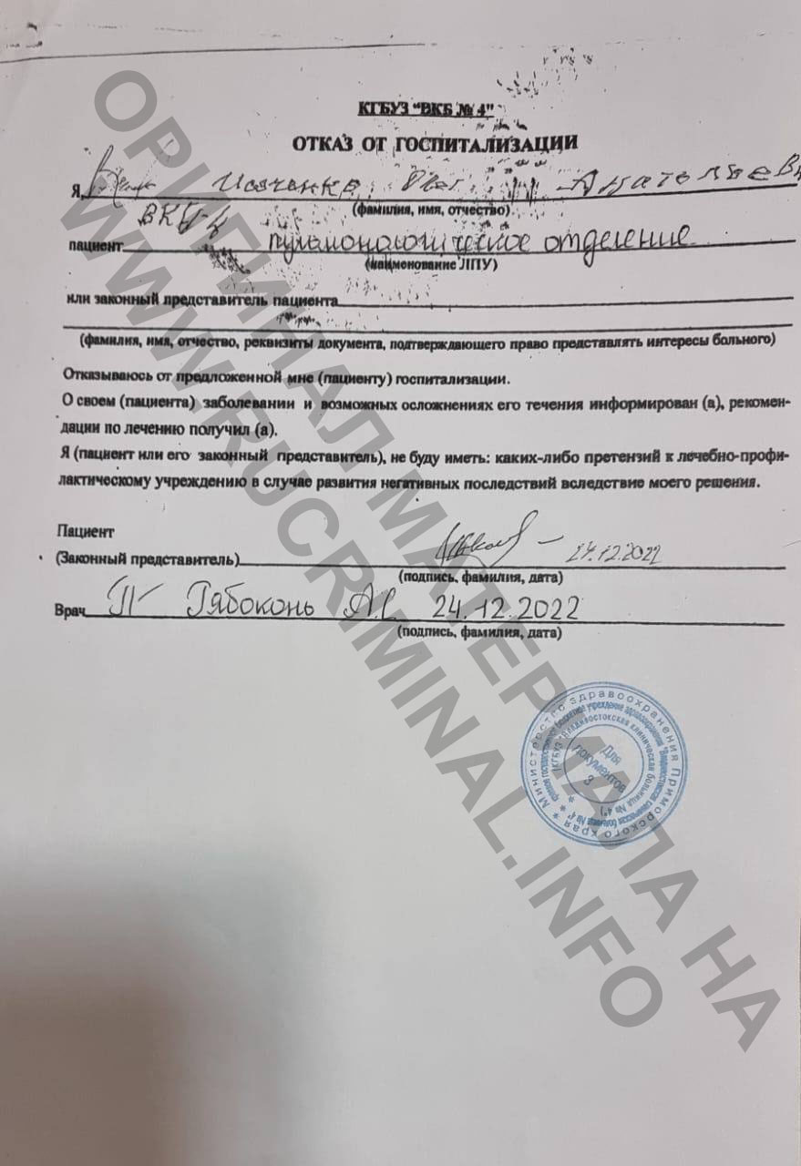«Исоченко Олег Анатольевич, поступил в КБУЗ № 4 города Владивостока, 20 декабря после обеда с направлением из поликлиники № 6, анализы крови и КТ лёгких с двусторонней пневмонией (с сопутствующим заболеванием лимфолейкоз в стадии ремиссии). Вечером я созвонилась с мужем у него взяли анализы и лечения ещё не было. 21 декабря в течении дня я звонила мужу, и в итоге утром взяли ещё анализы и лечения в течении дня не было! Как с КТ на руках с диагнозом пневмония и ничего не делают!