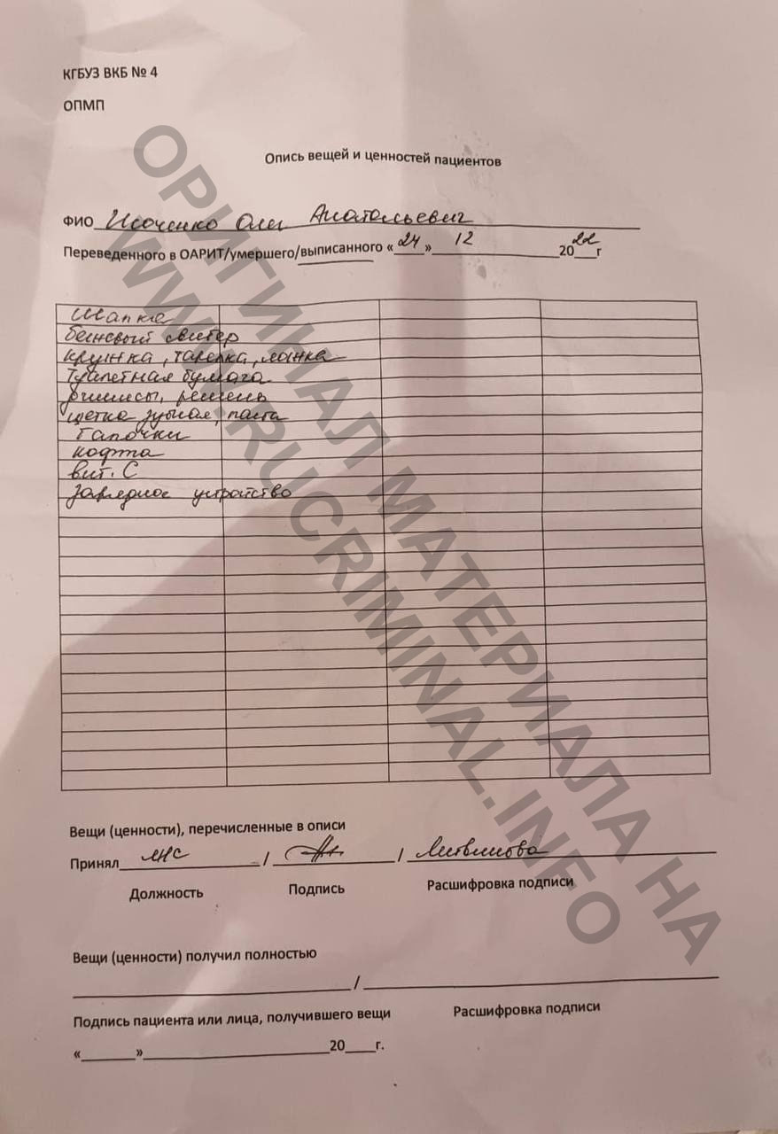 Реаниматолог мне по телефону рассказал, что, когда его начали реанимировать, то обнаружили на руке в вене катетер, и врачи поняли, что он из больницы. К сожалению, реанимация уже не помогла! В куртке в портмоне нашли водительское удостоверение, связались с больницей узнали, что он лежал в пульмонологическом отделении, там дали мой контактный телефон. Через некоторое время в этот же вечер, я все же дозвонилась до дежурного врача и хотела поинтересоваться как произошло, что больной оказался на улице и умер! На что мне ответили: "Он в 12 часов написал отказ от госпитализации и покинул больницу"! Я ответила, что в 14 часов он спал в палате со слов врача, значит ушел позже ответили мне. Это как? И как можно взять расписку у больного, который психически нестабилен, слаб и взять расписку, не сообщить контактному лицу? И выпустить на улицу с катетером в вене, без вещей! Утром, когда я приехала в больницу мне выдали вещи мужа, я увидела, что тёплый свитер, джинсы, шапка все в рюкзаке! Он ушел в трико и куртке без шапки! А вот лист отказа мне дали только в копии с печатью, но даже в копии я вижу, что писал её не Олег!