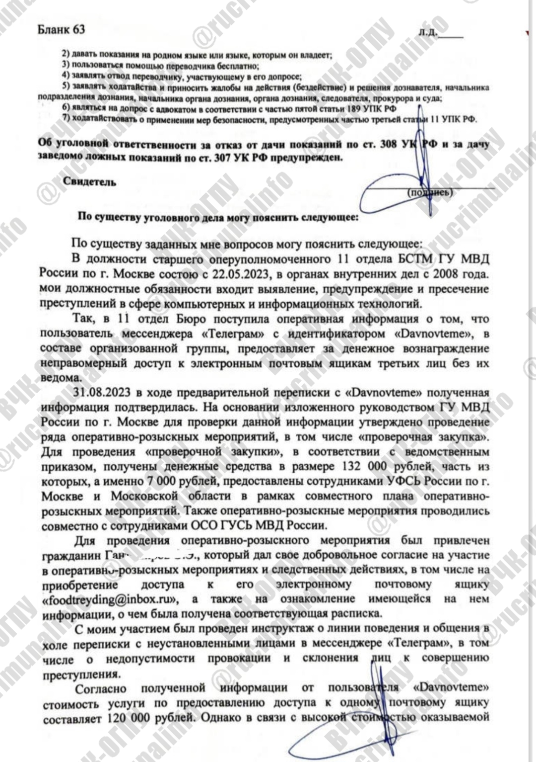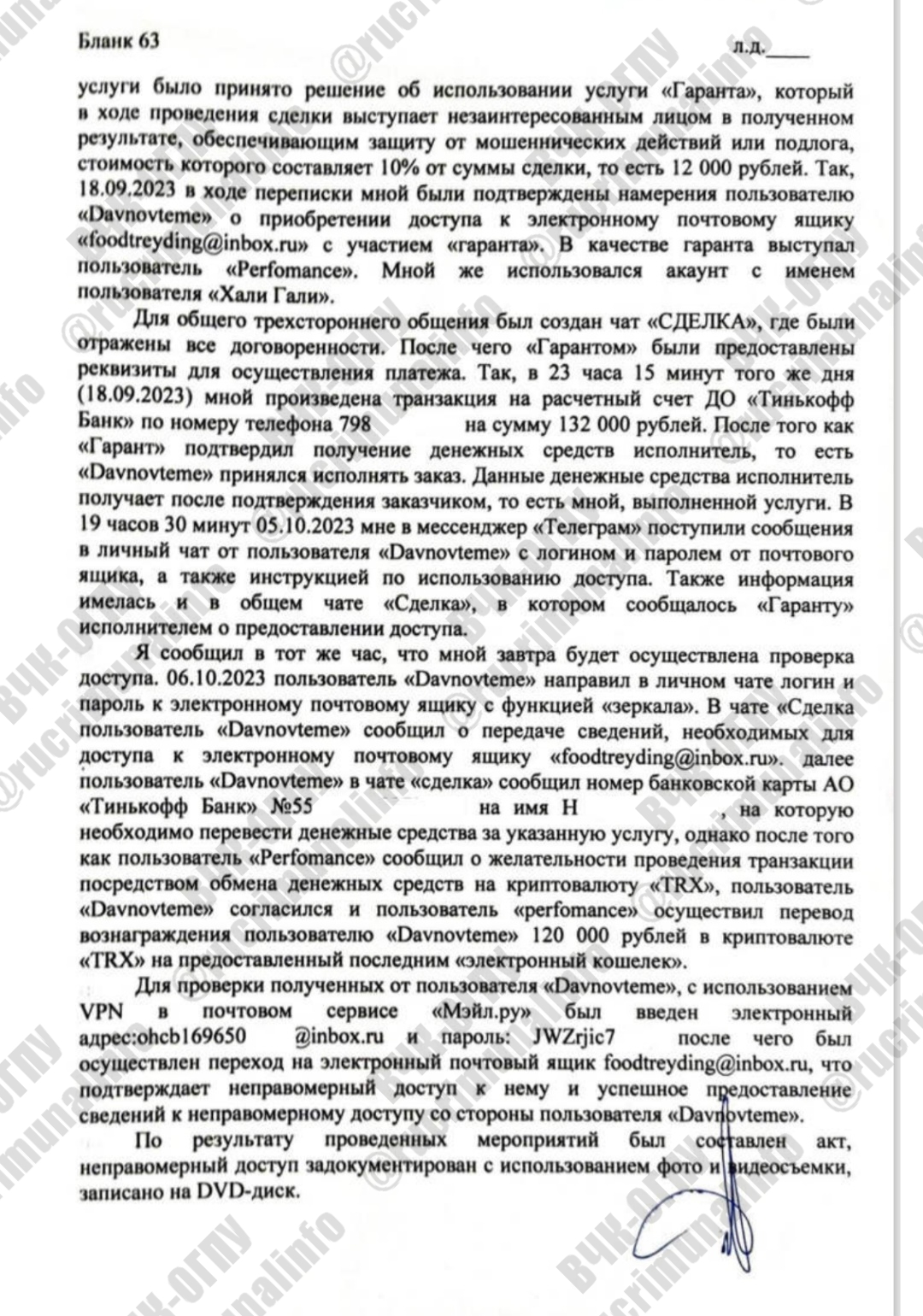 05.10.2023 г. Керимову от «davnovteme» пришёл логин и пароль от почты [email protected], которую предоставил «друг» Керимова – некий Г.Э.Э., давший добровольное согласие на участие в проверочной закупке (ПЗ) и подтвердивший, что почта принадлежит ему. Логин и пароль были от дублирующего ящика [email protected].