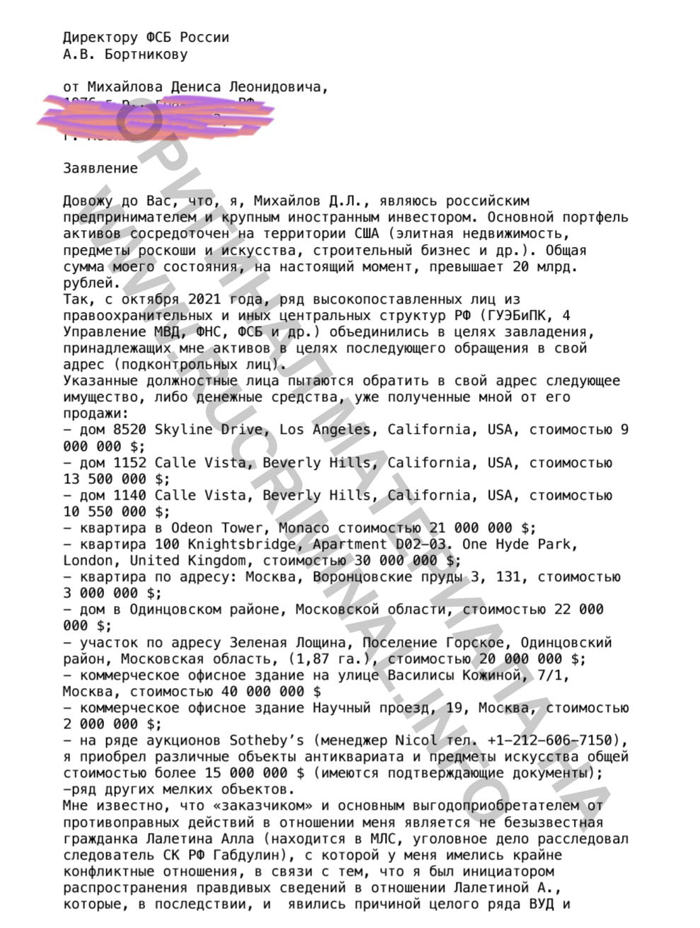 На основании изложенного прошу Вас принять меры и не допустить совершения в отношении меня (Михайлова Д.Л. и моих родственников и связей) противоправных действий, направленных на обращение в свою пользу принадлежащих мне денежных средств и имущества расположенного на территории РФ, США, Великобритании, Монако и других стран на сумму более 20 млрд. рублей. 15 февраля 2022 года Михайлов Д.Л».